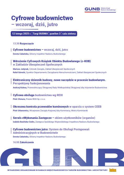 W organizowanym bloku merytorycznym przez Główny Urząd Nadzoru Budowlanego pod tytułem „Cyfrowe budownictwo – wczoraj, dziś, jutro” jako prelegent wziął udział Piotr Chmura prezes firmy REXI Sp. z o.o. i omówił tematykę: Cyfrowa obsługa budownictwa wg REXI.