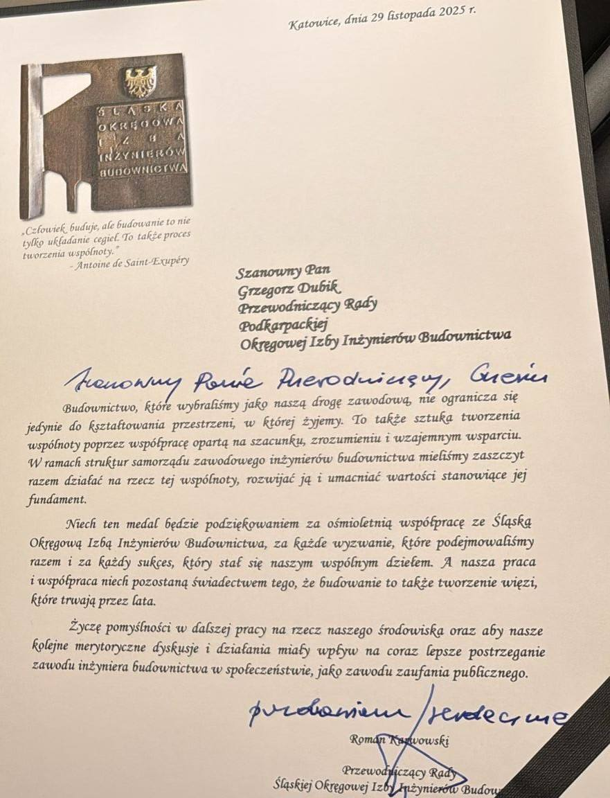 …Niech ten medal będzie podziękowaniem za ośmioletnią współpracę ze Śląską Okręgowa Izbą Inżynierów Budownictwa, za każde wyzwanie, które podejmowaliśmy razem i za każdy sukces, który stał się naszym wspólnym dziełem. A nasz a praca i współpraca niech pozostaną świadectwem tego, że budowanie to także tworzenie więzi, które trwają przez lata…” Roman Karwowski przewodniczący OR Śląskiej OIIB.