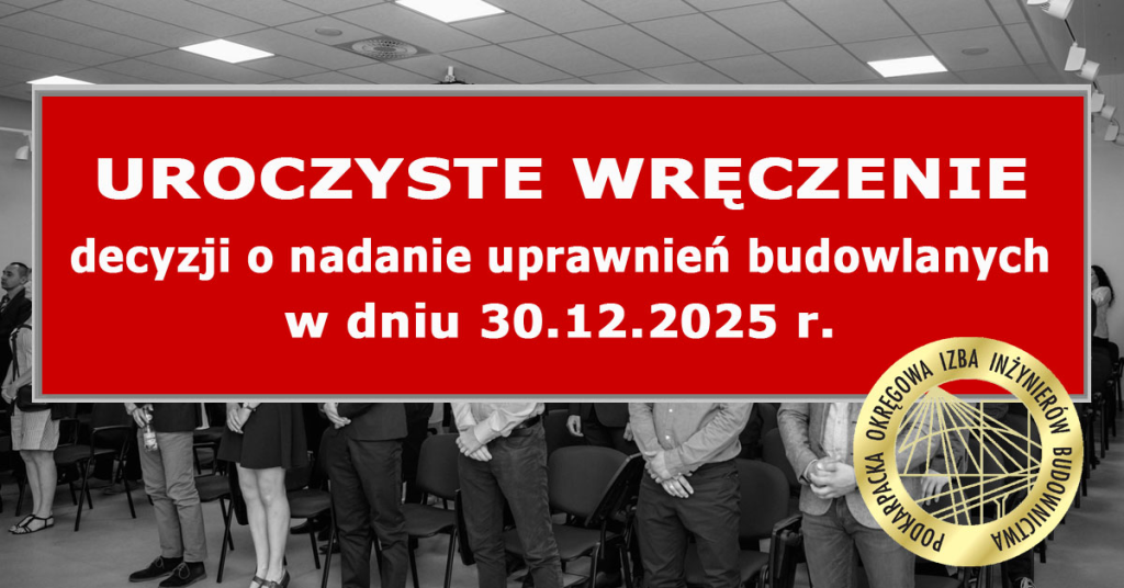 Uprzejmie zapraszamy na uroczyste wręczenie decyzji o nadanie uprawnień budowlanych, które odbędzie się w dniu 30 grudnia 2025 r. o godzinie 10.00 w budynku Podkarpackiej Okręgowej Izby Inżynierów Budownictwa w Rzeszowie przy ul. Krakowskiej 289 dla wszystkich specjalności: