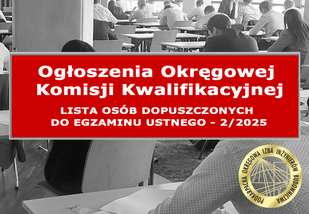 Egzaminy ustne będą przeprowadzane w siedzibie Podkarpackiej Okręgowej Izbie Inżynierów Budownictwa ul. Krakowska 289, 35-213 Rzeszów.