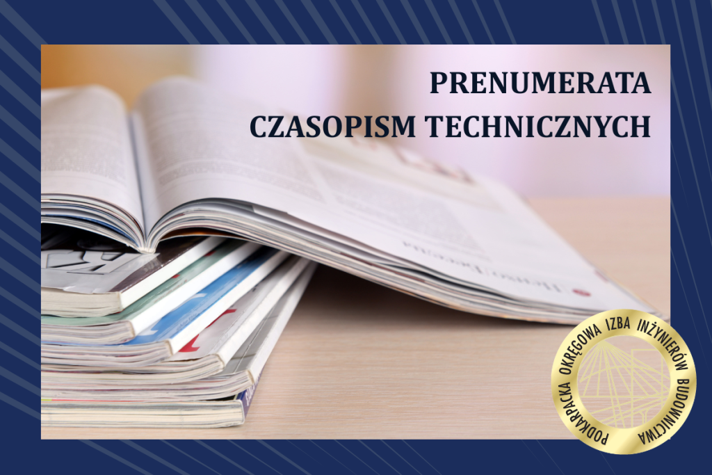 Prenumerowanie przez członka (przy wsparciu finansowym) wybranego czasopisma nie wyklucza go z możliwości nabycia dodatkowej prenumeraty wybranego przez siebie czasopisma z ww. listy po obniżonej cenie (wynegocjowanej przez KDZ), lecz z pominięciem dofinansowania, zgodnie z Regulaminem wspierania doskonalenia zawodowego czynnych członków Podkarpackiej Okręgowej Izby Inżynierów Budownictwa.